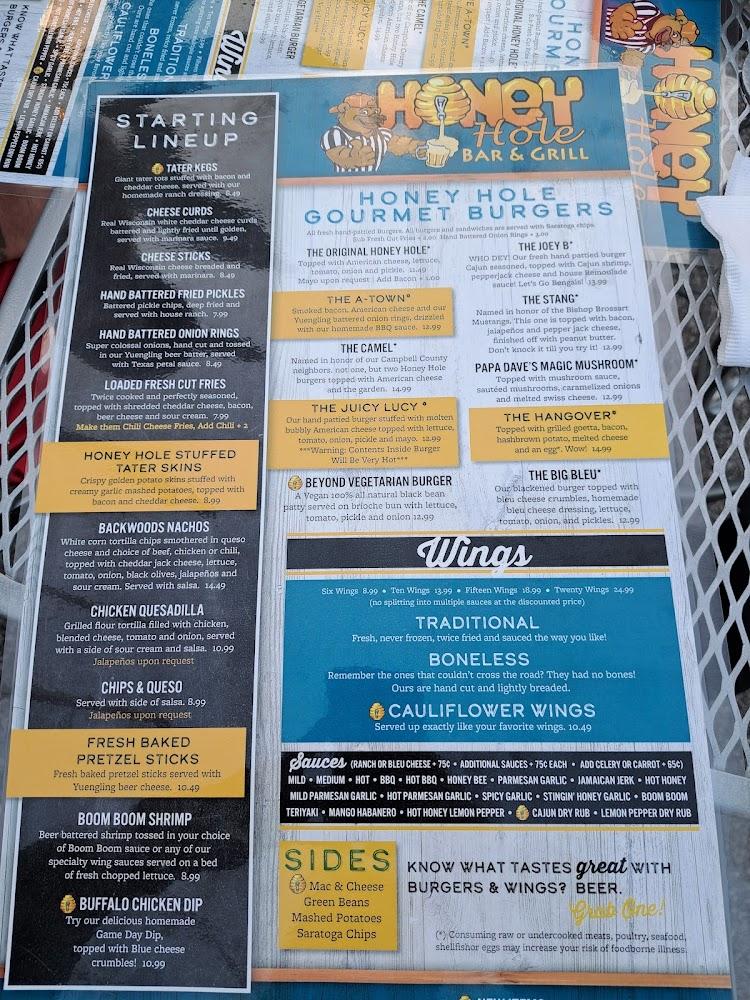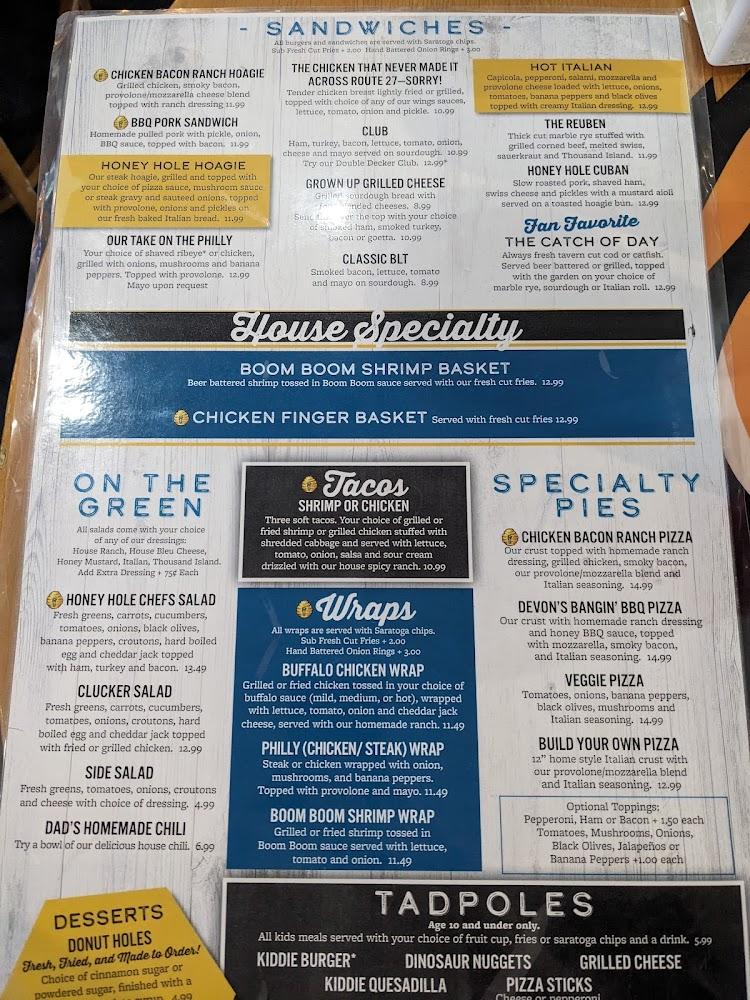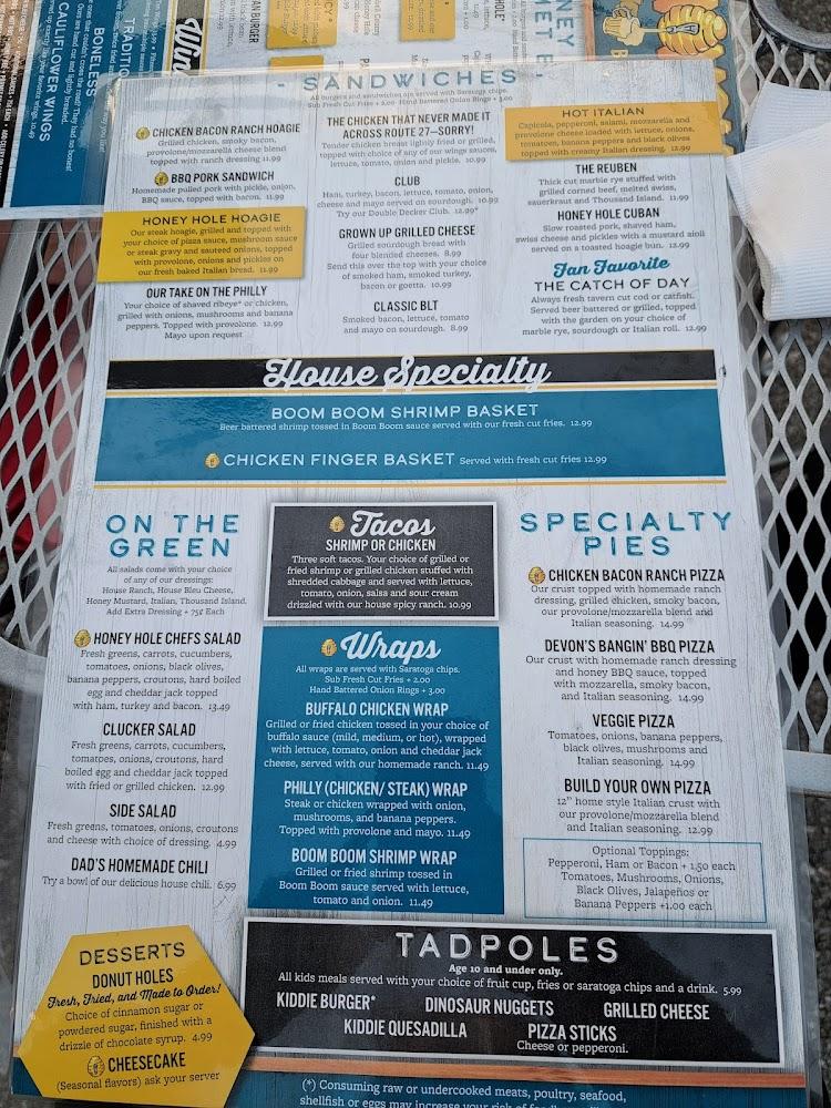 The menu at Honey Hole Bar & Grill features a diverse range of dishes. It includes everything from burgers to bar snacks. Over 60 options cater to a wide audience. The Honey Hole Gourmet Burgers section is particularly popular.